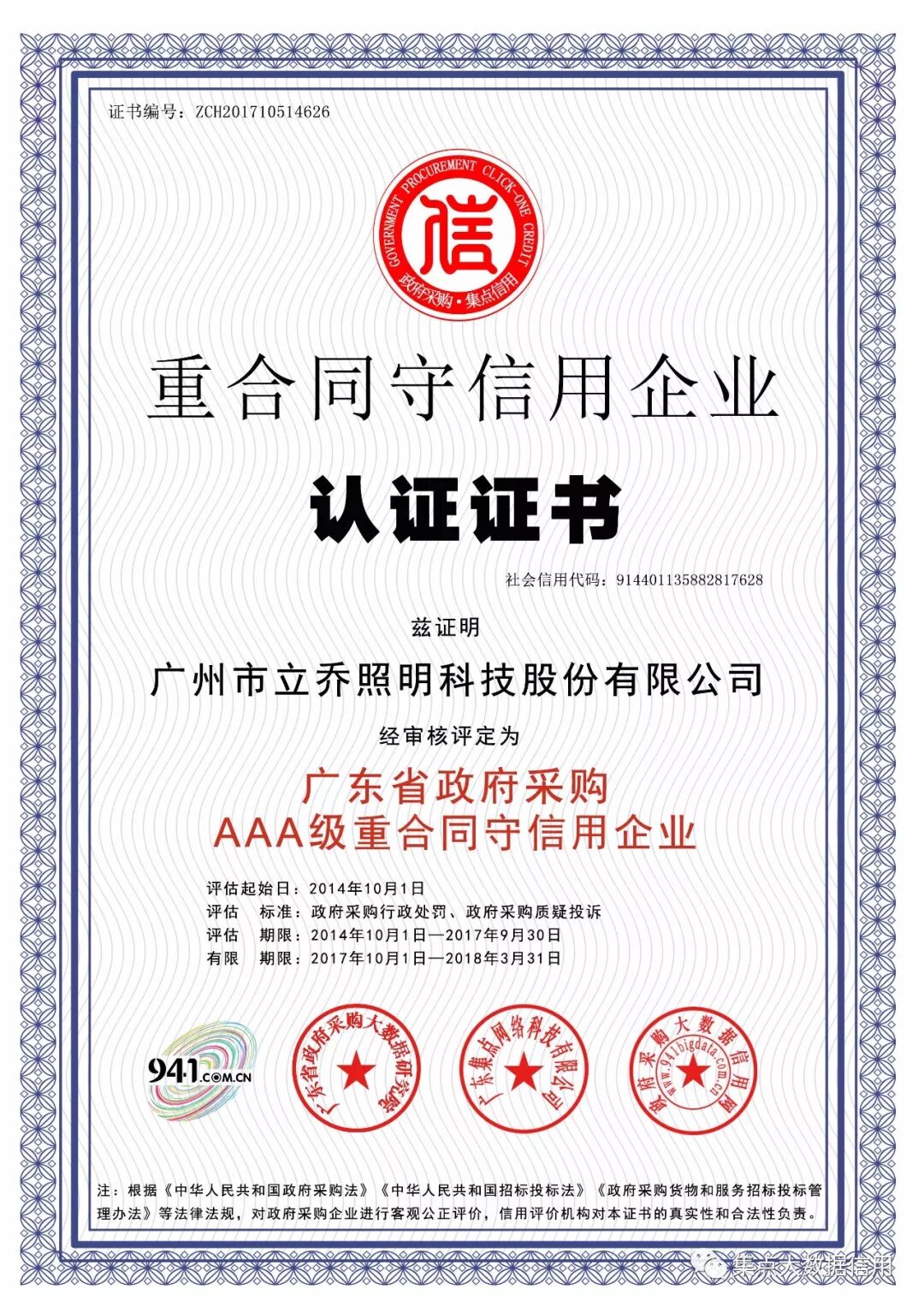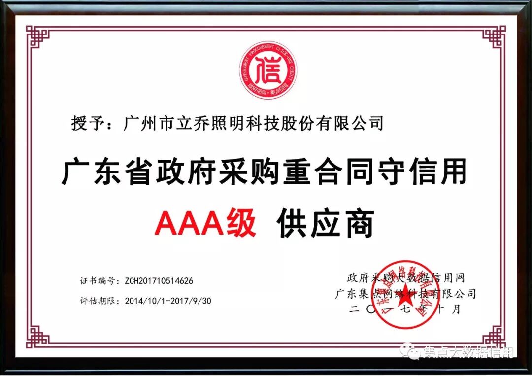 立乔照明政府采购诚信守法信用AAA级荣誉牌匾