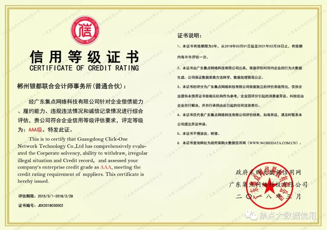 在本次项目投标过程中,郴州银都联合会计师事务所(普通合伙)使用第三方信用评级机构集点科技所出具的企业AAA级信用证书,成功通过本次政府采购项目资格审查,获得政府采购项目投标信用资格!