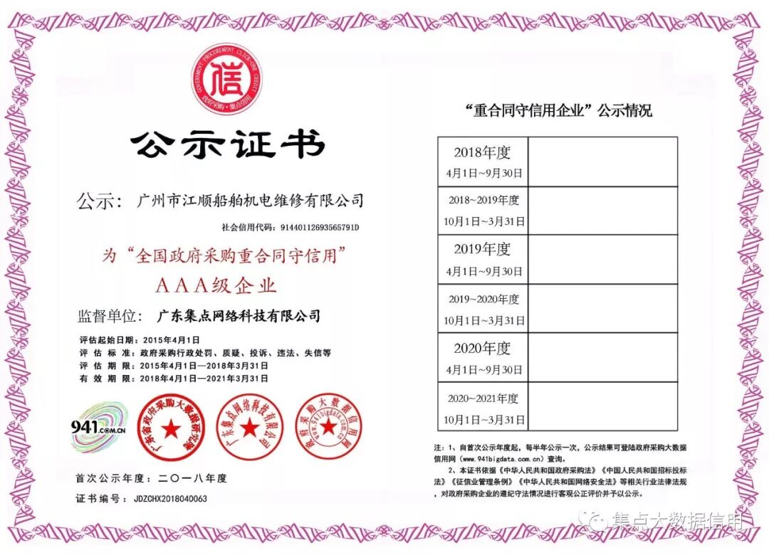 江顺船舶全国政府采购重合同守信用AAA级荣誉证书