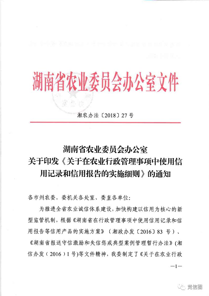 为推进全省农业诚信体系建设,加快构建以信用为核心的新型监管机制,根据《湖南省在行政管理事项中使用信用记录和信用报告等信用产品的实施方案》(湘政办发〔2016〕83号)、《湖南省报送守信激励和失信惩戒典型案例管理暂行办法》(湘信办发﹝2016﹞1号)等文件精神,我委制定了《关于在农业行政管理事项中使用信用记录和信用报告的实施细则》,现印发你们,认真组织实施。