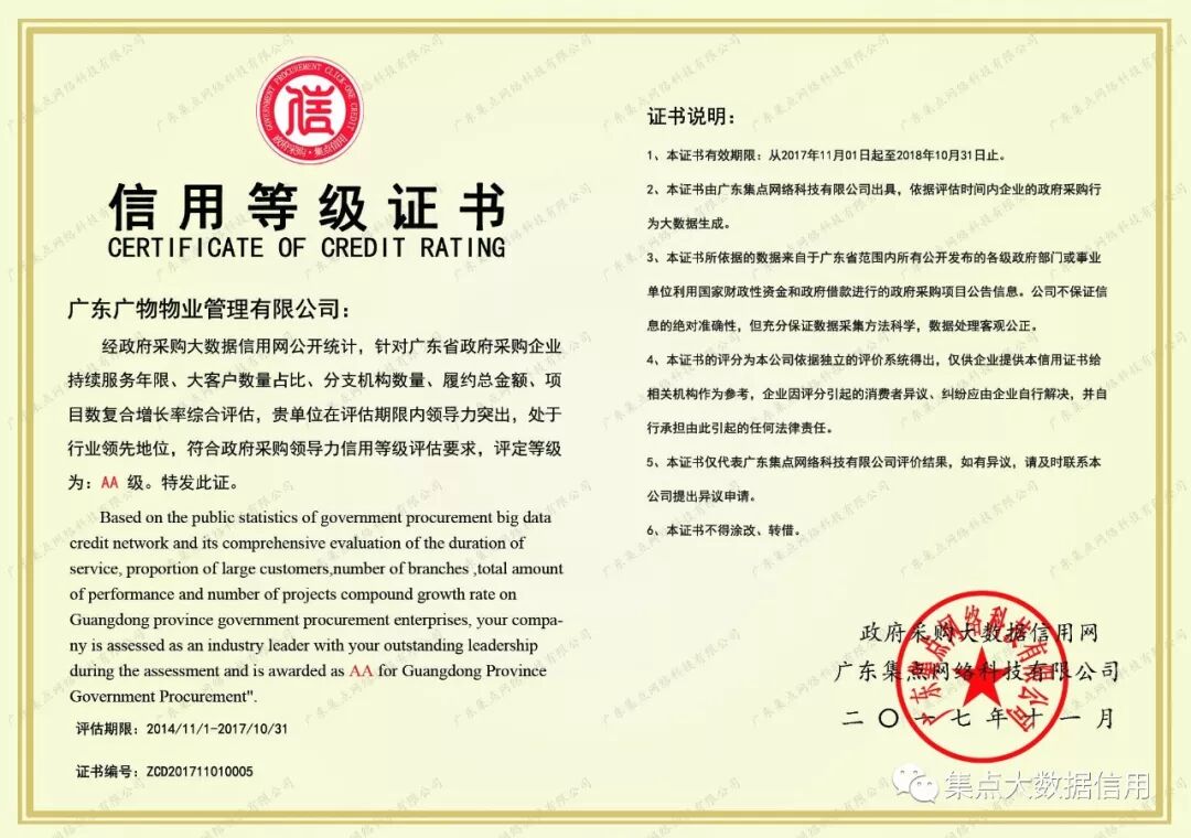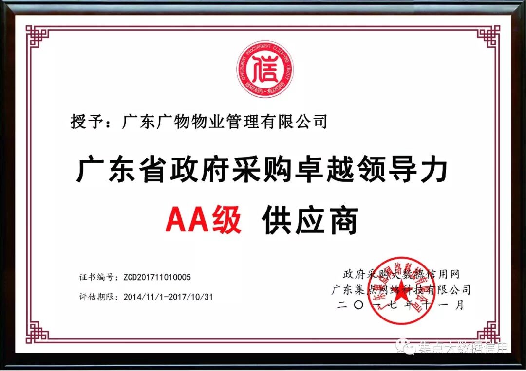 广物物业广东省政府采购卓越领导力AA级荣誉证书
