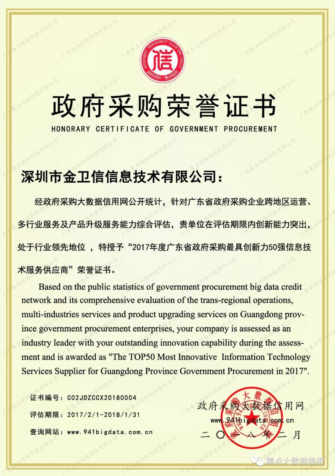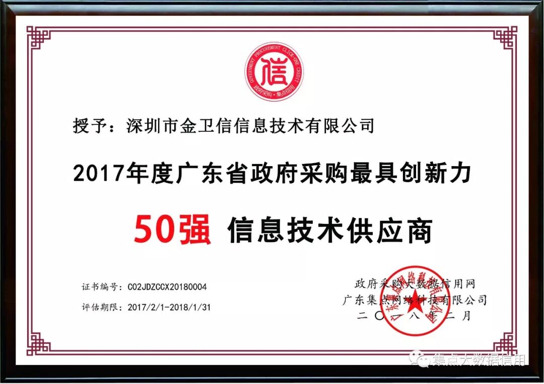 金卫信政府采购最具创新力50强荣誉证书