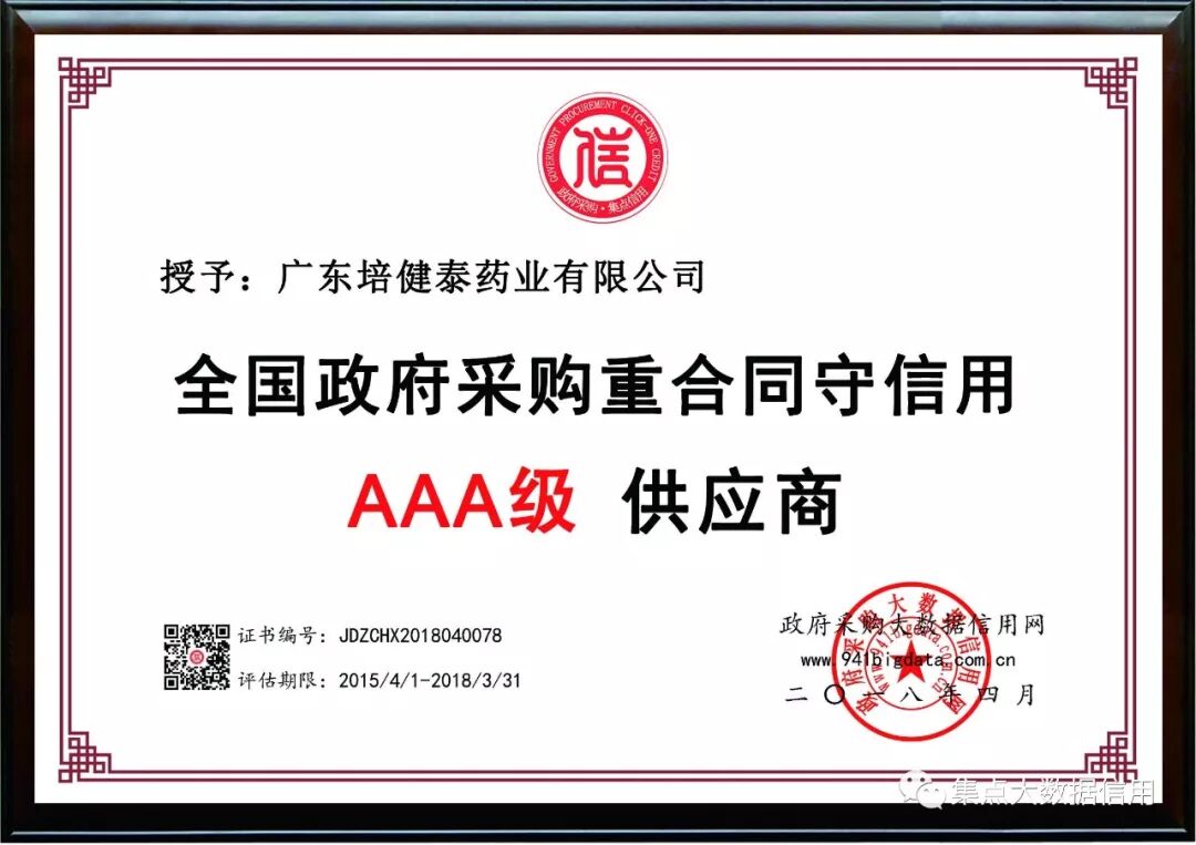 培健泰药业全国政府采购重合同守信用AAA级荣誉证书