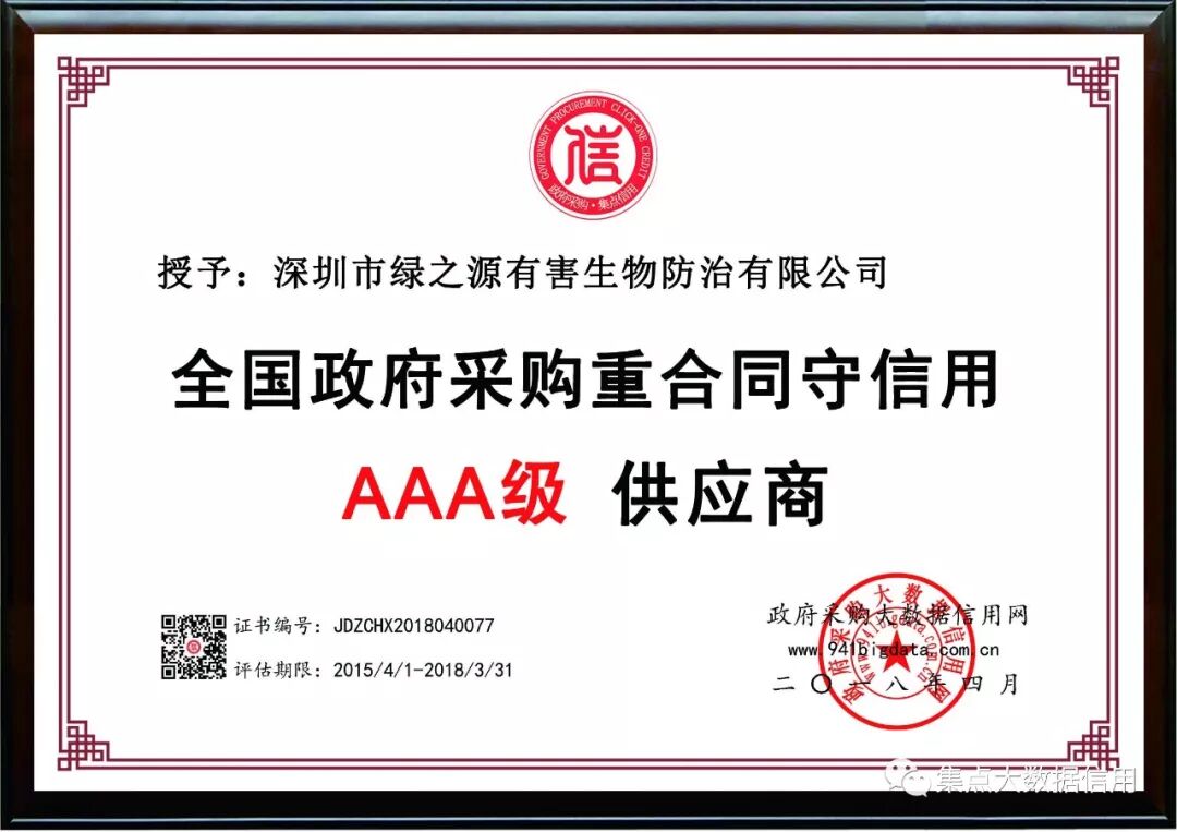 深圳市绿之源有害生物防治有限公司是一个集森林、园林绿化、苗圃、花卉、培育、种植施工、园林森林病虫害防治和生物农药销售于一体的大型综合性企业。公司自创建以来,不断扩展业务量,坚持“科技为本,追求卓越”的服务宗旨,已高质量地完成了对多个大型的园林、林地的施工改造工程和对园林森林植物上的有害生物的防治工作。公司现已有一支实力雄厚的专业性施工队伍,积累了丰富的造林施工、森林、园林病虫害防治经验,具备了较高的造林施工森林、园林病虫害防治能力。公司本次经第三方政府采购大数据信用评级机构“集点大数据信用”评定为全国政府采购重合同守信用AAA级供应商!