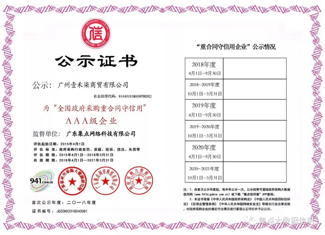 壹禾柒商贸政府采购企业诚信分