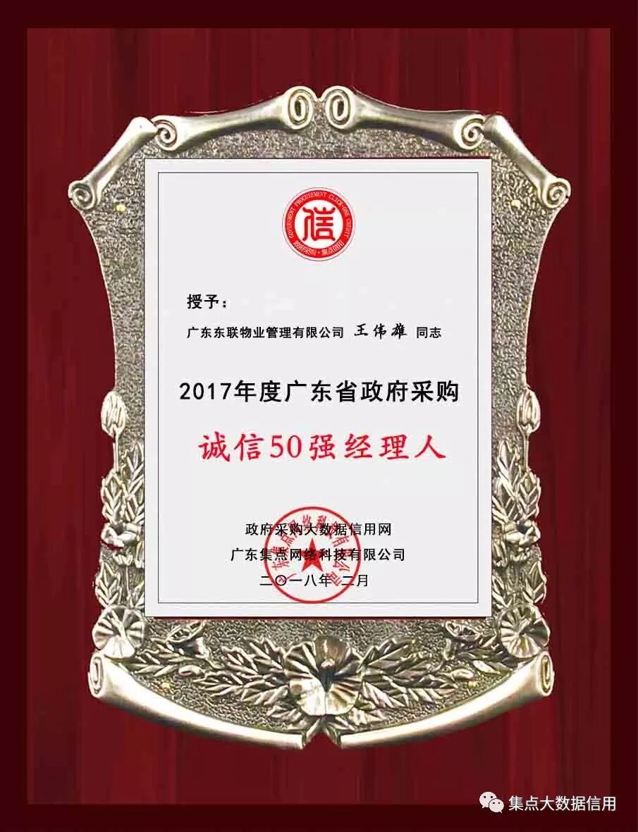东联物业政府采购诚信50强经理人荣誉牌匾