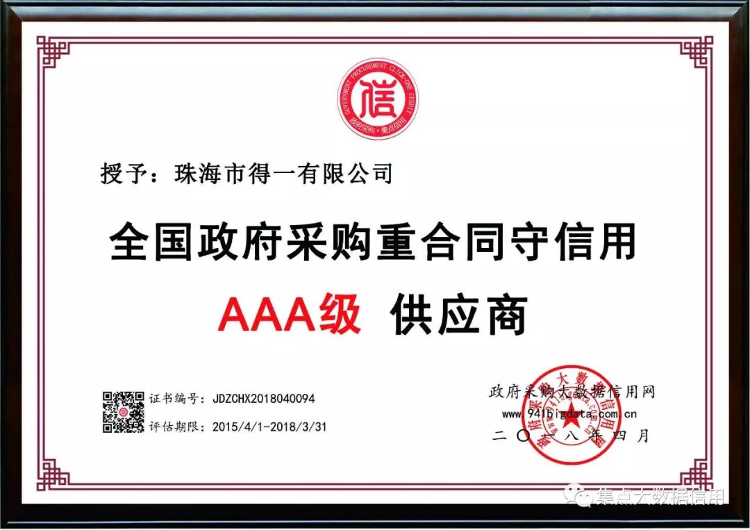 珠海市得一有限公司成立于1997年6月16日,注册资本4000万,位于珠海市明珠北路381号豪华花园D座楼,公司以经营连锁超市为主,遍布珠海香洲、斗门、金湾各区。公司本次经第三方政府采购大数据信用评级机构“集点大数据信用”评定为全国政府采购重合同守信用AAA级供应商!
