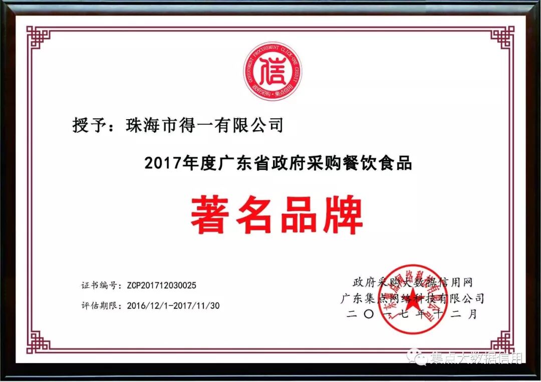珠海市得一有限公司成立于1997年6月16日,注册资本4000万,位于珠海市明珠北路381号豪华花园D座楼,公司以经营连锁超市为主,遍布珠海香洲、斗门、金湾各区。本次经独立第三方政府采购大数据信用评级机构“集点大数据信用”评定为“2017年度广东省政府采购餐饮食品著名品牌”荣誉称号供应商!