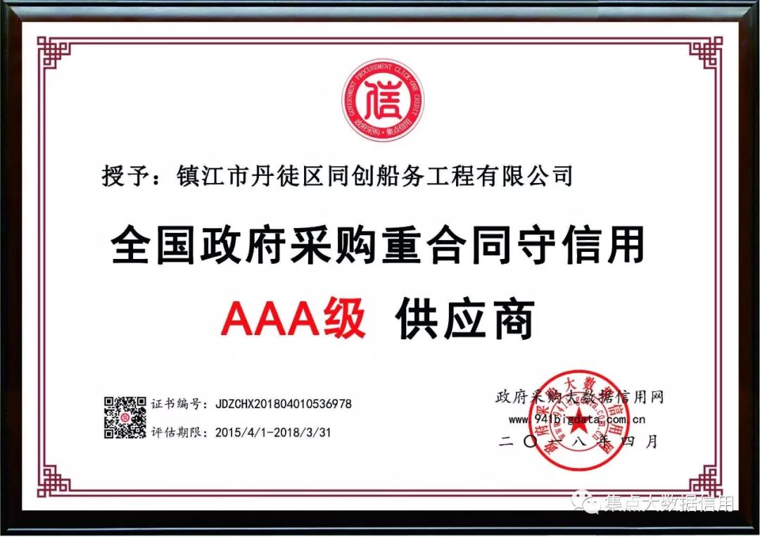 同创船务全国政府采购重合同守信用AAA级荣誉证书