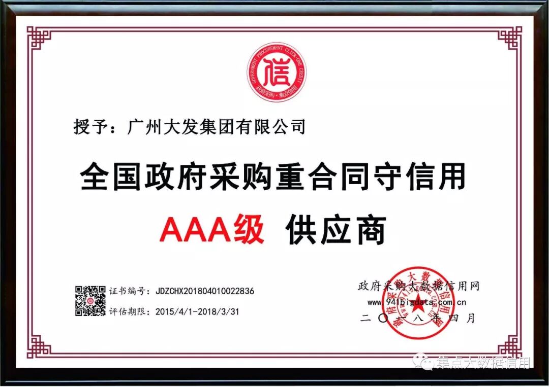 大发集团全国政府采购重合同守信用AAA级荣誉证书