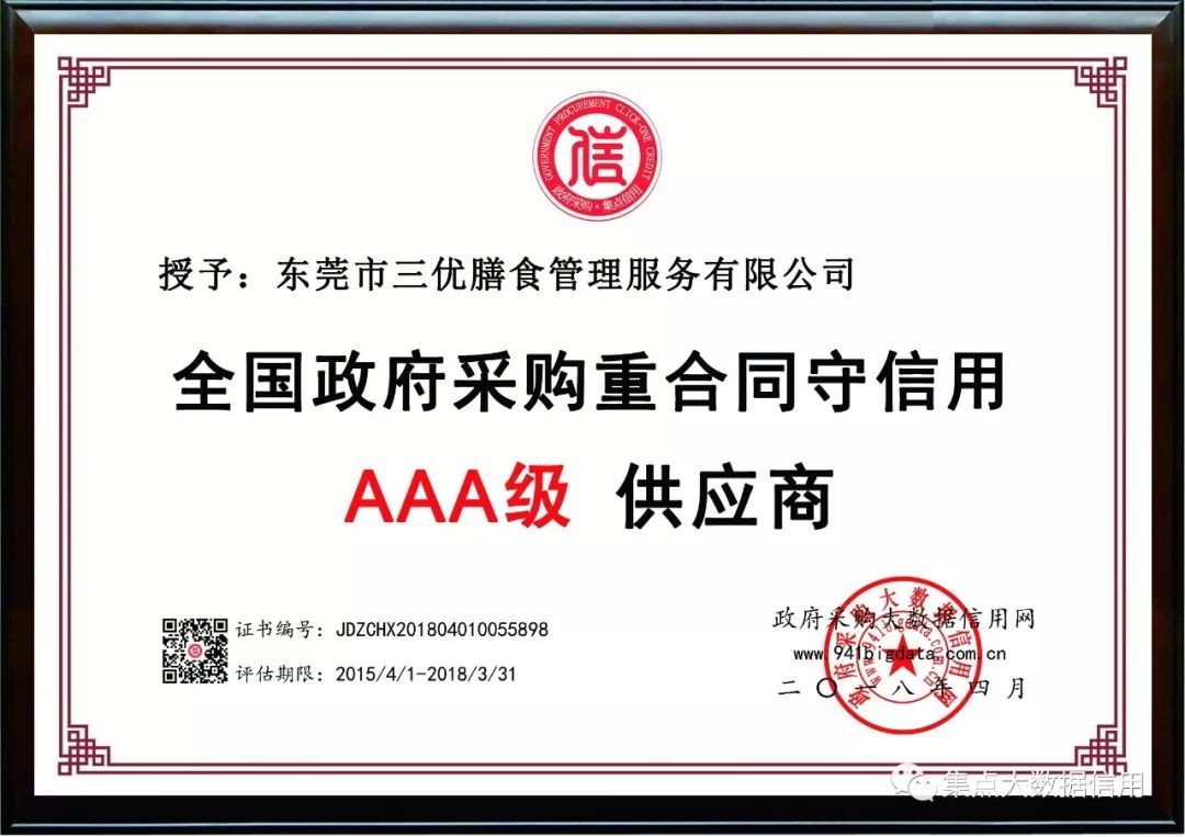 三优膳食全国政府采购重合同守信用AAA级荣誉证书