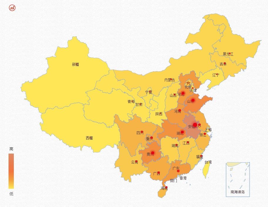全国各省(直辖市、自治区)级地区政府采购失信数据显示,安徽、山东、贵州三省失信指数较高,尤其是是安徽省,远高于其他省级地区,达到20.03%,青海省、上海市、西藏自治区、新疆维吾尔自治区等地失信指数较低,均低于0.5%。