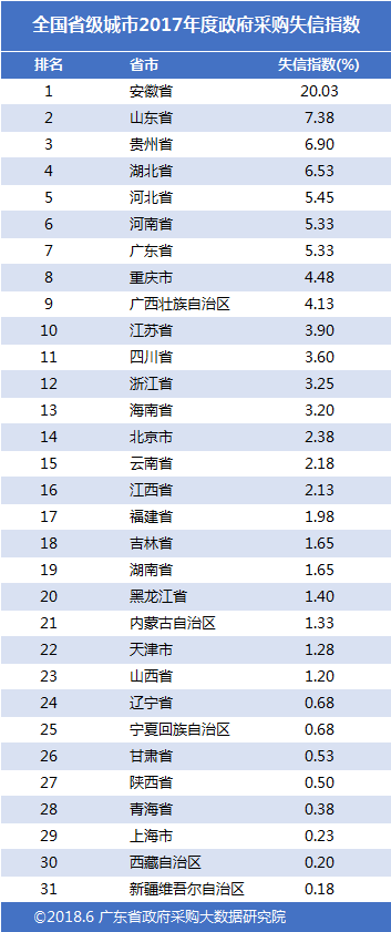 政府采购大数据 | 全国省级城市2017年度政府采购失信指数发布