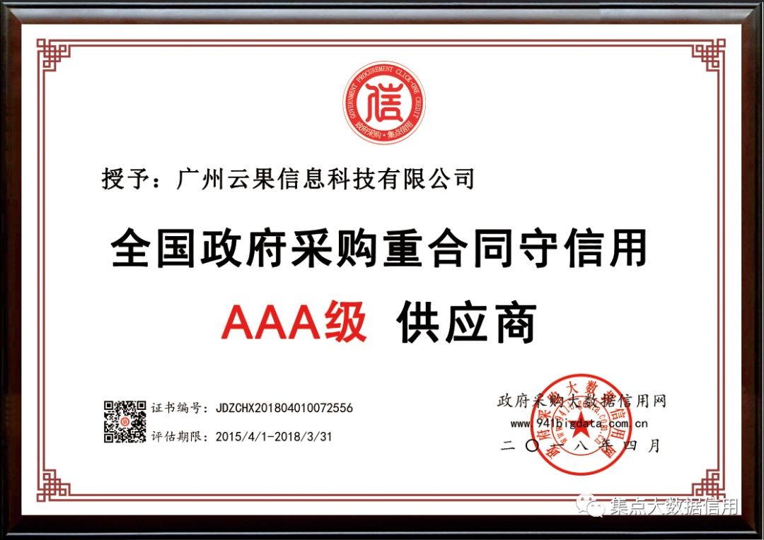 云果信息科技全国政府采购重合同守信用AAA级荣誉牌匾
