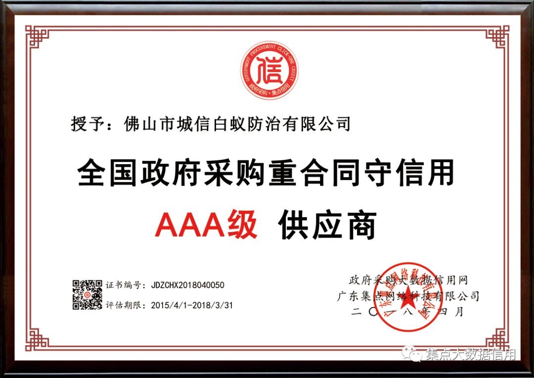 城信白蚁防治全国政府采购重合同守信用AAA级荣誉牌匾