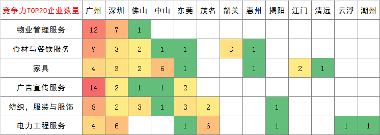榜单数据显示,广东省政府采购竞争力TOP20供应商物业管理服务主要分布于广州、深圳;食材与餐饮服务主要分布于广州、深圳、韶关;家具主要分布于中山、广州、深圳;广告宣传服务主要分布于广州;纺织,服装与服饰主要分布于广州、佛山、东莞;电力工程服务主要分布于深圳、茂名、广州。