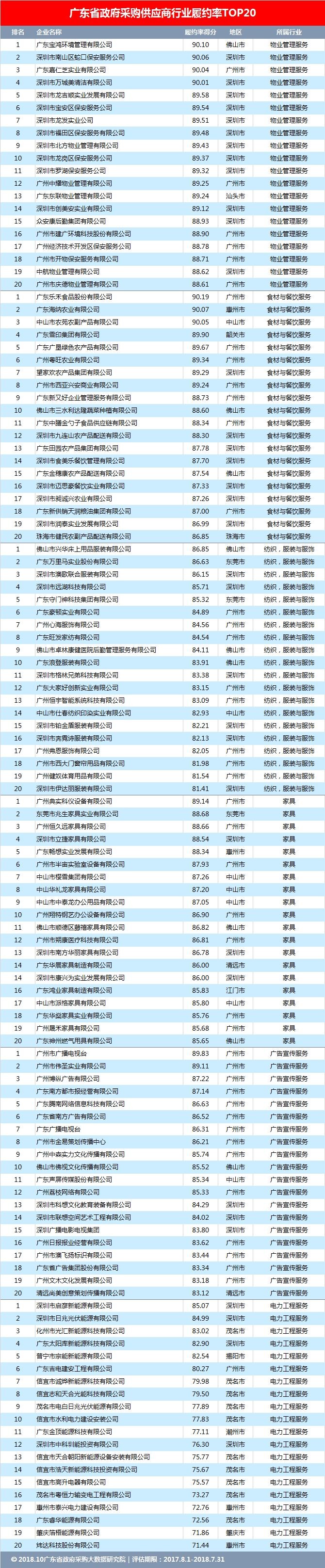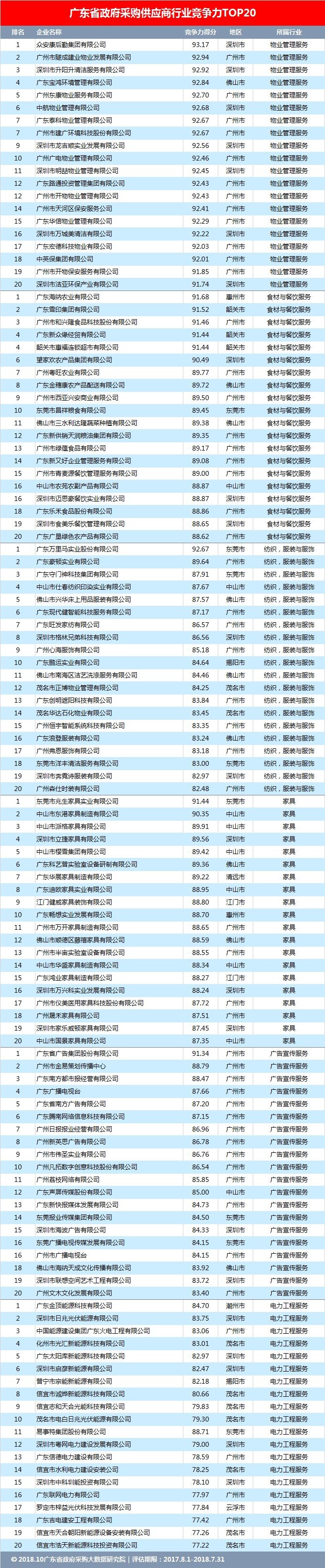 政府采购大数据 | 2018年度广东省政府采购供应商竞争力&履约率&服务质量行业TOP20榜单发布
