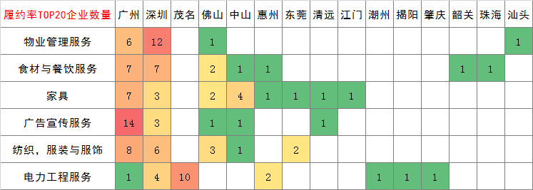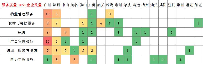 榜单数据显示,广东省政府采购服务质量TOP20供应商物业管理服务主要分布于深圳、广州;食材与餐饮服务主要分布于广州、深圳;家具主要分布于广州、中山;广告宣传服务主要分布于广州;纺织,服装与服饰主要分布于广州、深圳、佛山;电力工程服务主要分布于茂名、深圳。