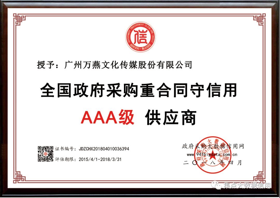 万燕文化传媒全国政府采购重合同守信用AAA级荣誉牌匾