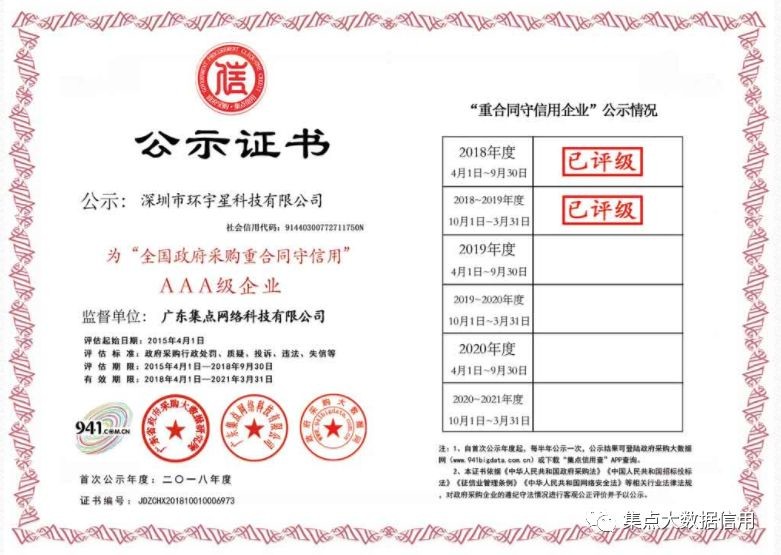 环宇星科技全国政府采购重合同守信用AAA级荣誉证书