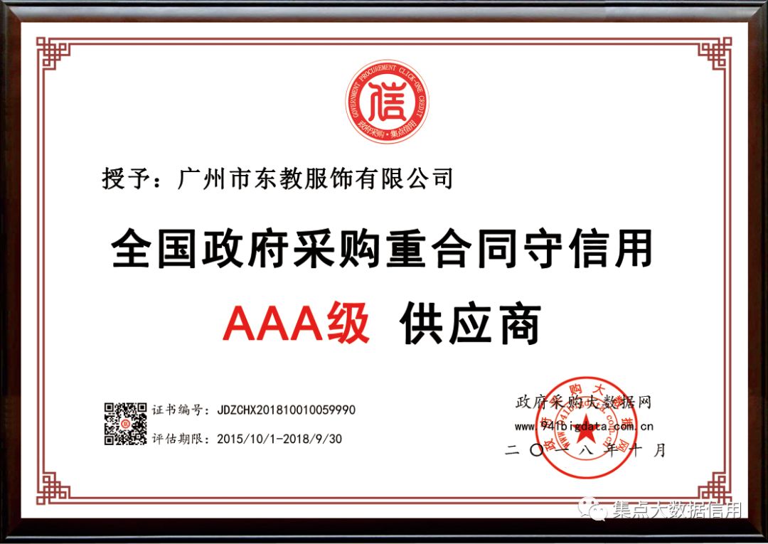 东教服饰全国政府采购重合同守信用AAA级荣誉牌匾