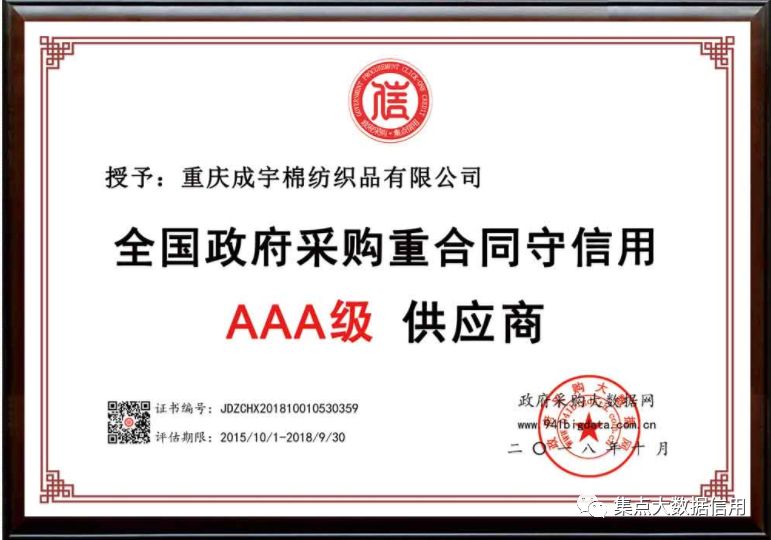 经广东省政府采购大数据研究院综合评价,重庆成宇棉纺织品有限公司被第三方政府采购大数据信用评级机构“集点大数据信用”评定为全国政府采购重合同守信用AAA级供应商!