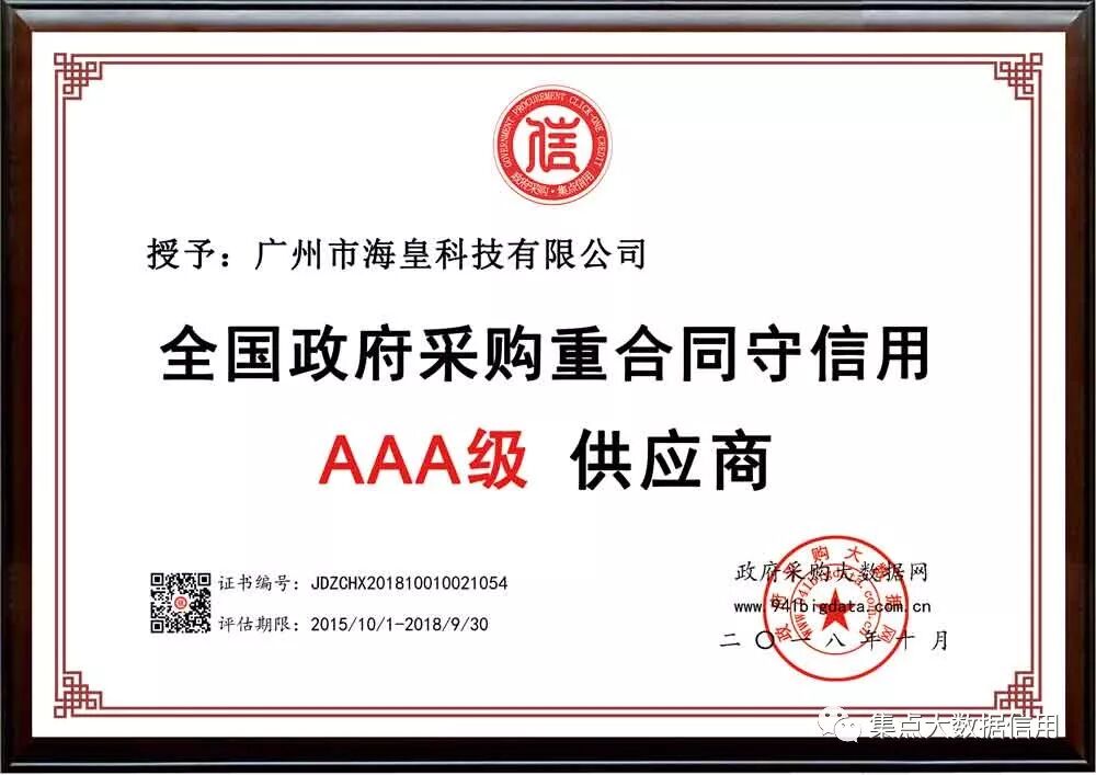 经广东省政府采购大数据研究院综合评价,广州市海皇科技有限公司被第三方政府采购大数据信用评级机构“集点大数据信用”评定为全国政府采购重合同守信用AAA级供应商!