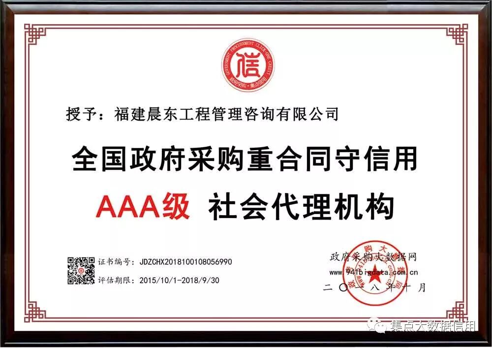 经广东省政府采购大数据研究院综合评价,福建晨东工程管理咨询有限公司被第三方政府采购大数据信用评级机构“集点大数据信用”评定为全国政府采购重合同守信用AAA级供应商!