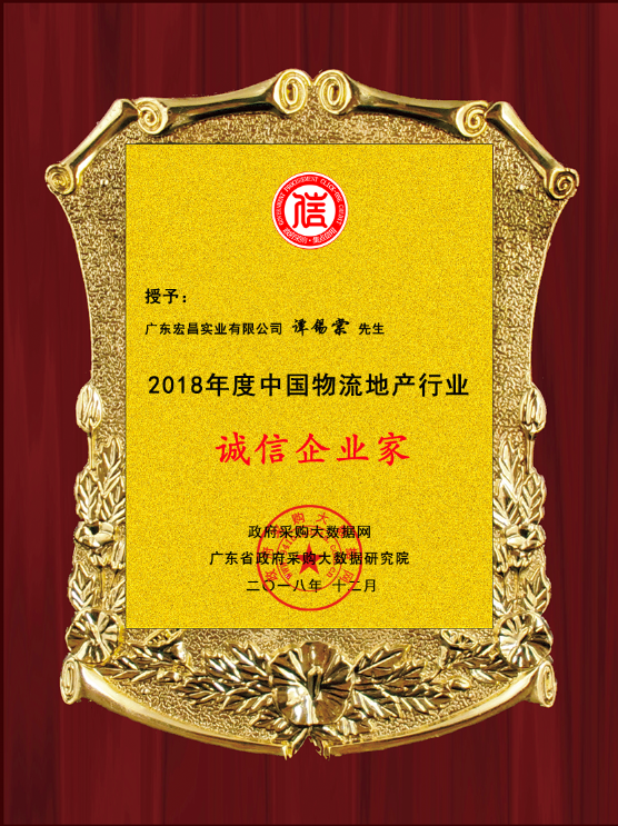 经政府采购大数据网&广东省政府采购大数据研究院综合评价,授予广东宏昌实业有限公司董事长谭锡棠先生“2018年度中国物流地产行业诚信企业家”荣誉称号!