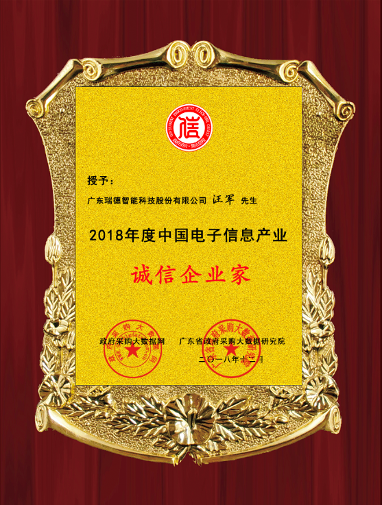 经政府采购大数据网&广东省政府采购大数据研究院综合评价,授予广东瑞德智能科技股份有限公司董事长汪军先生“2018年度中国电子信息产业诚信企业家”荣誉称号!
