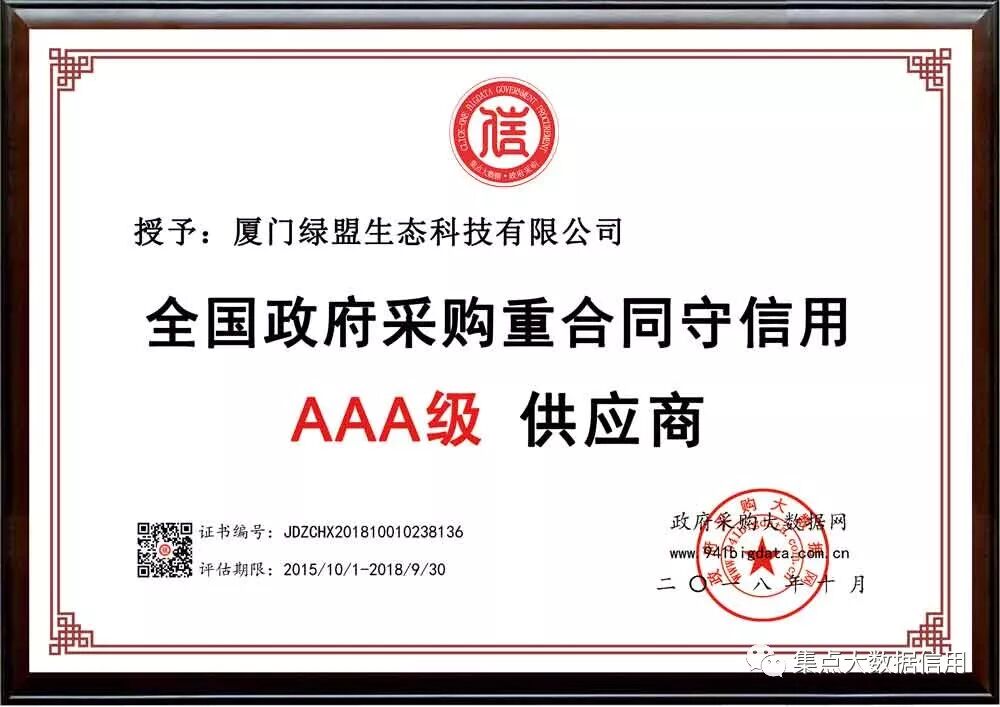 诚信企业红名单|每日一荐:厦门绿盟生态科技有限公司 2018年12月6日 浏览:127 经政府采购大数据网&广东省政府采购大数据研究院综合评价,厦门绿盟生态科技有限公司被第三方政府采购大数据信用评级机构“集点大数据信用”评定为全国政府采购重合同守信用AAA级供应商! 绿盟生态全国政府采购重合同守信用AAA级荣誉牌匾