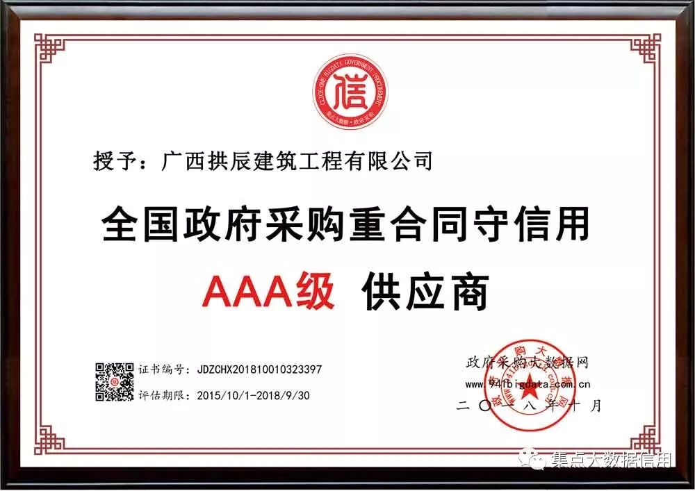 诚信企业红名单|每日一荐:广西拱辰建筑工程有限公司 2018年12月10日 浏览:96 经政府采购大数据网&广东省政府采购大数据研究院综合评价,广西拱辰建筑工程有限公司被第三方政府采购大数据信用评级机构“集点大数据信用”评定为全国政府采购重合同守信用AAA级供应商! 拱辰建筑全国政府采购重合同守信用AAA级荣誉牌匾