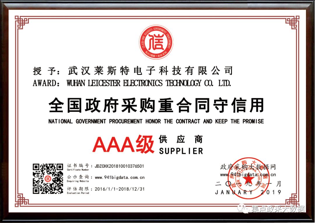 经政府采购大数据网&广东省政府采购大数据研究院&广东集点网络科技有限公司三方联合评价,武汉莱斯特电子科技有限公司被第三方政府采购大数据信用评级机构“集点大数据信用”评定为全国政府采购重合同守信用AAA级供应商!