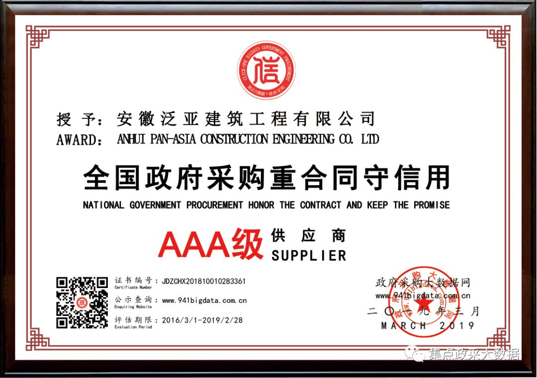 经政府采购大数据网&广东省政府采购大数据研究院&广东集点网络科技有限公司三方联合评价,安徽泛亚建筑工程有限公司被第三方政府采购大数据信用评级机构“集点大数据信用”评定为全国政府采购重合同守信用AAA级供应商!