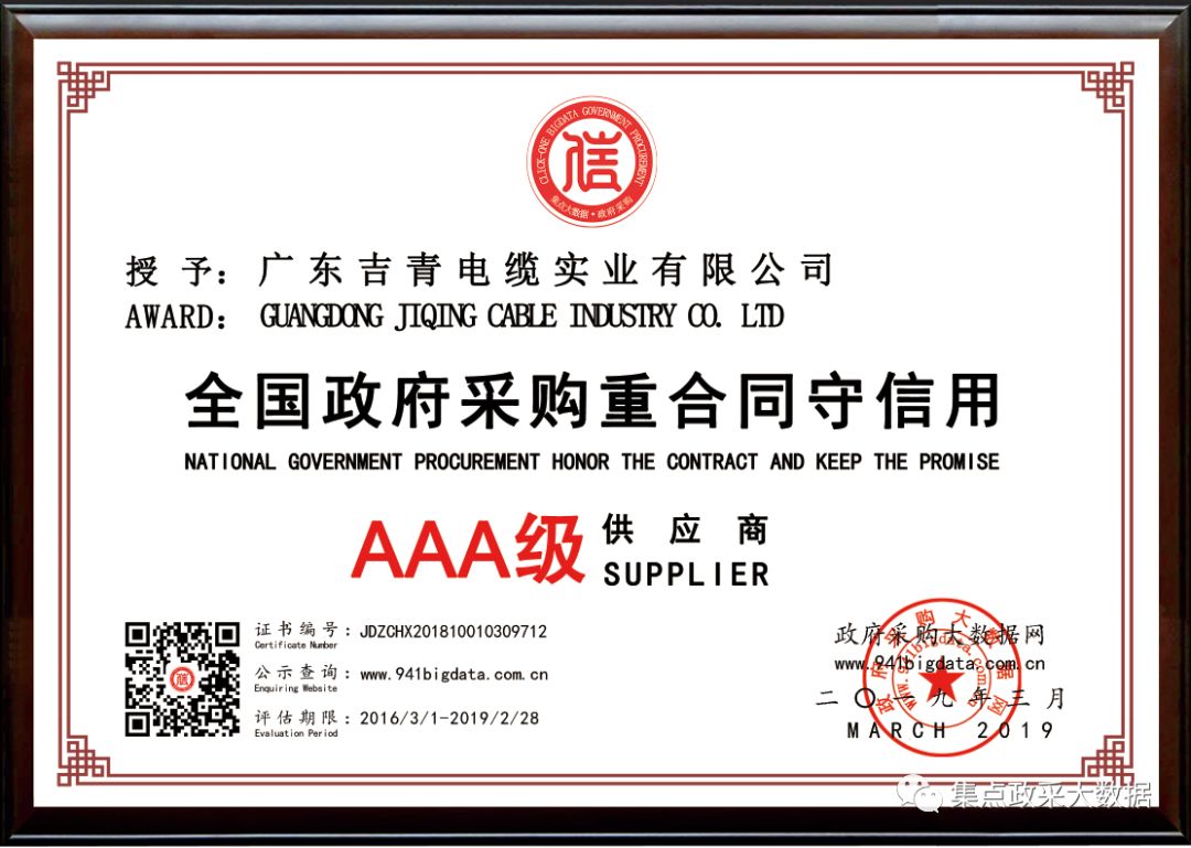经政府采购大数据网&政府采购大数据研究院&广东集点网络科技有限公司三方联合评价,广东吉青电缆实业有限公司被第三方政府采购大数据信用评级机构“集点大数据信用”评定为全国政府采购重合同守信用AAA级供应商!