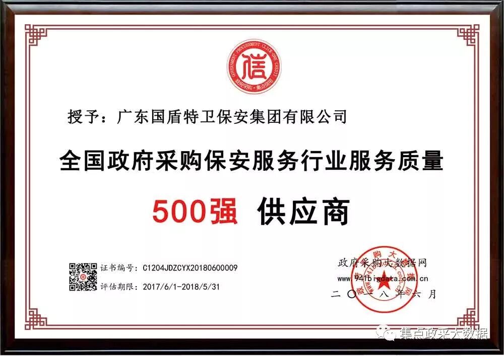 经政府采购大数据网&政府采购大数据研究院&广东集点网络科技有限公司三方联合评价,广东国盾特卫保安集团有限公司被第三方政府采购大数据信用评级机构“集点大数据信用”评定为全国政府采购保安服务行业服务质量500强供应商!