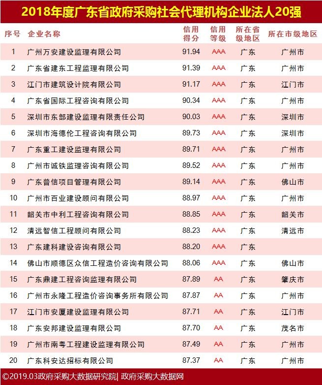 政府采购大数据|2018年度广东省政府采购企业法人诚信100强暨行业20强榜单发布
