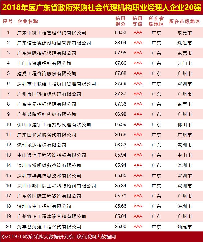 本报告(榜单)中采取全样本分析,涵盖了全国政府采购社会代理机构和供应商。本报告中的研究数据一律来源于全国各级政府采购公开信息。具体数据源包括:国家级政府采购网公开项目信息、各级地方政府部门公开采购信息中公布的公开项目信息以及信用中国网等。经政府采购大数据研究院和政府采购大数据网对企业进行政府采购大数据信用评估,为政府采购职业经理人信用评估优秀的企业予以公示,联合发布:2018年度广东省政府采购职业经理人100强暨行业20强榜单。评估期为1年,评估时段为:2018年1月1日至2018年12月31日。