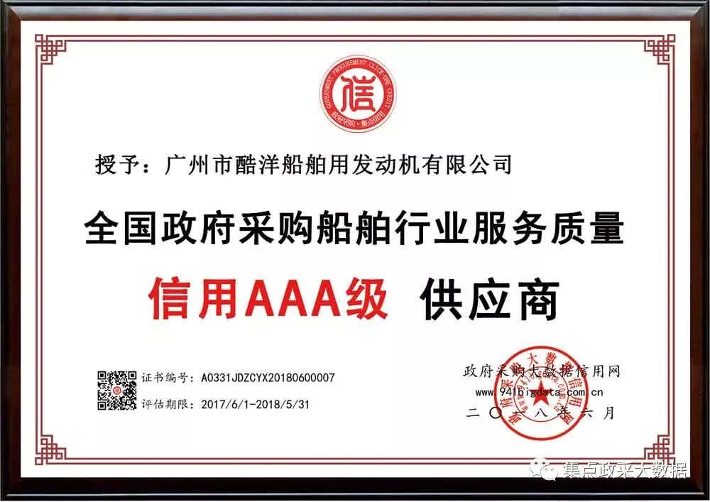 经政府采购大数据网&政府采购大数据研究院&广东集点网络科技有限公司三方联合评价,广州市酷洋船舶用发动机有限公司被第三方政府采购大数据信用评级机构“集点大数据信用”评定为全国政府采购船舶行业服务质量信用AAA级供应商!