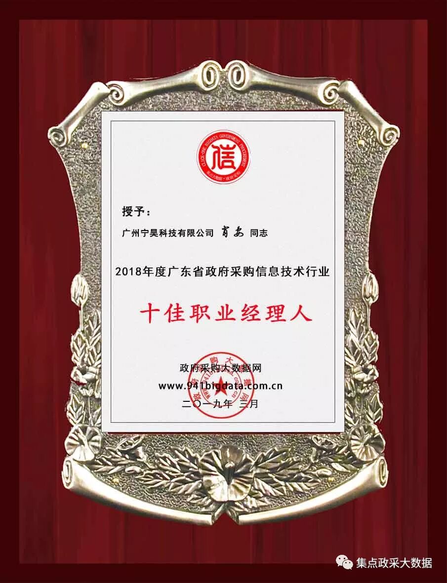 经政府采购大数据网&政府采购大数据研究院&广东集点网络科技有限公司三方联合评价,广州宁昊科技有限公司肖安同志被第三方政府采购大数据信用评级机构“集点大数据信用”评定为2018年度广东省政府采购信息技术行业十佳职业经理人!