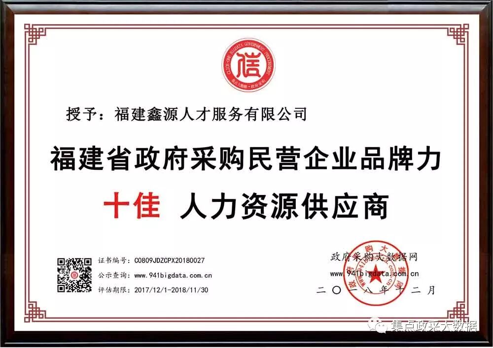 经政府采购大数据网&政府采购大数据研究院&广东集点网络科技有限公司三方联合评价,福建鑫源人才服务有限公司被第三方政府采购大数据信用评级机构“集点大数据信用”评定为福建省政府采购民营企业品牌力十佳人力资源供应商!
