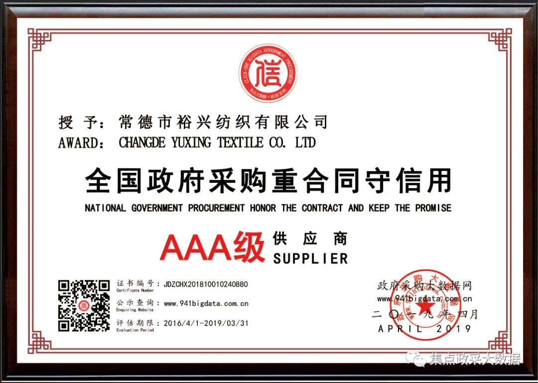经政府采购大数据网&政府采购大数据研究院&广东集点网络科技有限公司三方联合评价,常德市裕兴纺织有限公司被第三方政府采购大数据信用评级机构“集点大数据信用”评定为全国政府采购重合同守信用AAA级供应商!
