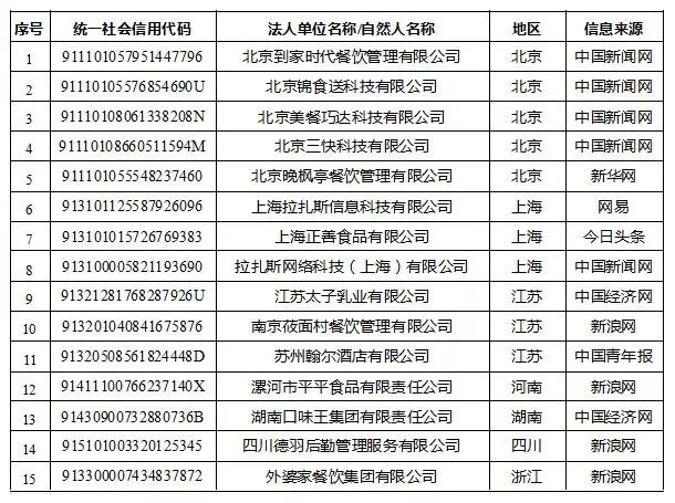 3月份媒体披露危害食品安全失信案例共涉及15家企业,分布在北京、上海、江苏、浙江、湖南、河南、四川等省份(见表2)。