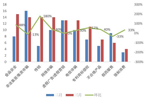 从失信行为类型看,3月份失信案例主要涉及危害食品安全(10%)、传销(9%)、网络诈骗(9%)、电信诈骗(9%)、非法集资(9%)、虚假广告/虚假营销(9%)、专利商标侵权(7%)、不合格产品(5%)、假药贩售(4%)等行为,其中危害食品安全、传销、网络诈骗、电信诈骗、非法集资、虚假广告/虚假营销的案例数量合计占总数的55%(见图2)。