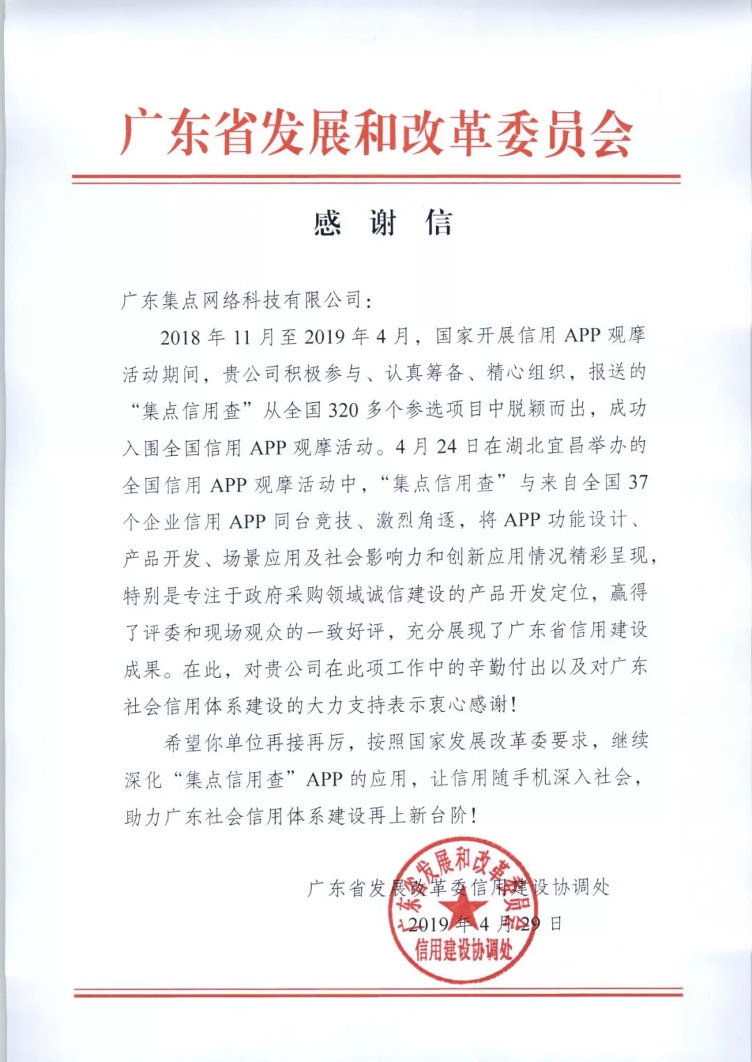 4月29日,广东集点网络科技有限公司喜获广东省发展改革委信用建设协调处的感谢信,以表彰集点科技公司在本次全国信用APP观摩活动中的优异表现。