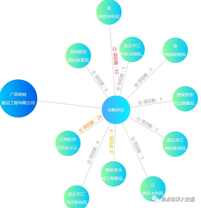 广西明桂建设工程有限公司关联预警图显示出与它高度合作的前十采购单位。关联度最高的采购单位是龙州县水利局,中标项目数为52 个,其中竞争性谈判占比92.31%!与关联度排第二的江州区扶贫开发办公室均有相同之处,中标项目为竞争性谈判方式占比最高,为87.5%,更意想不到的是这19个中标项目均出自同一代理机构!!