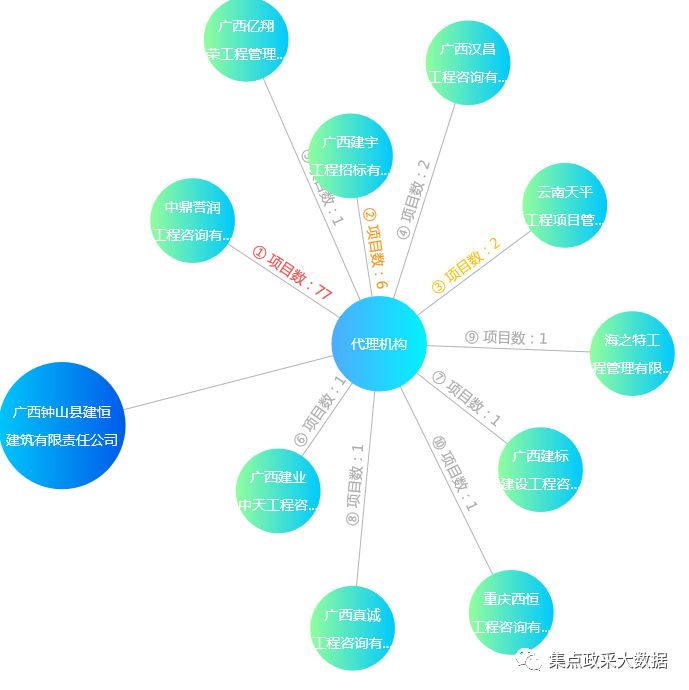 广西钟山县建恒建筑有限责任公司关联预警图显示出与它关联度最高的代理机构。其中与中鼎誉润工程咨询有限公司的合作关系最密切,中标项目数达77个,中标项目为竞争性谈判方式占比为88.12%。同时可以看到该供应商的中标项目高度集中于一家代理机构,项目数占比为82.22%!! 且在该家代理机构的中标率达到76.24%……