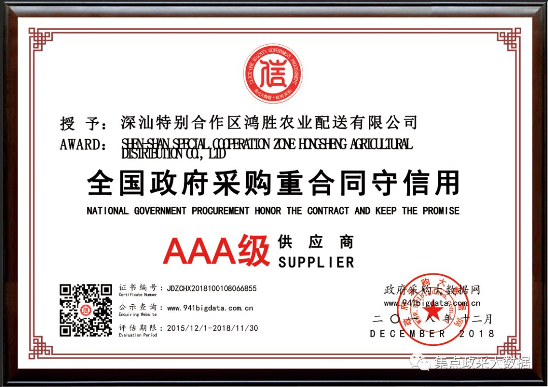 政府采购企业红名单|祝贺深汕特别合作区鸿胜农业配送有限公司荣获全国政府采购重合同守信用AAA级供应商