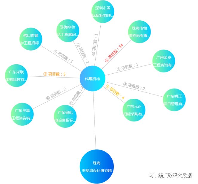 由政府采购大数据网震撼推出的”企业关联预警图”可视化可以监测到政府采购代理机构与供应商之间的合作频率、合作关系等情况。