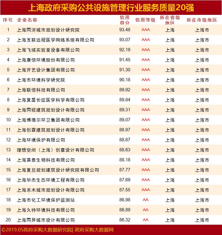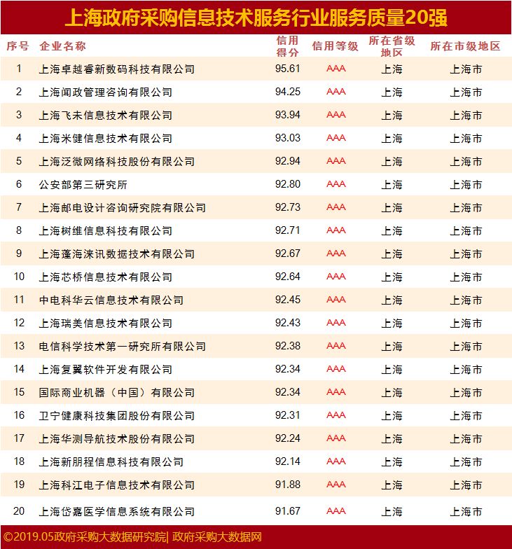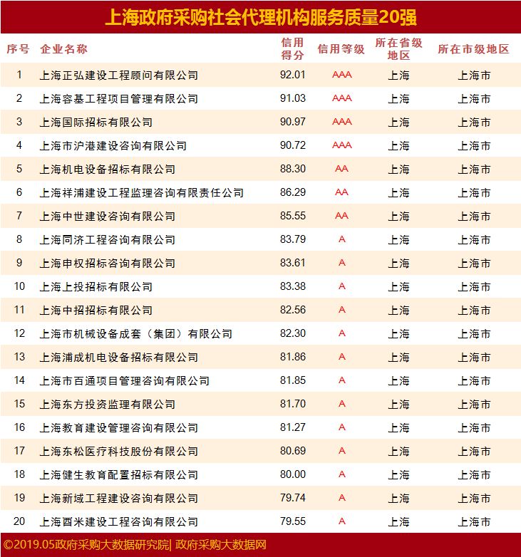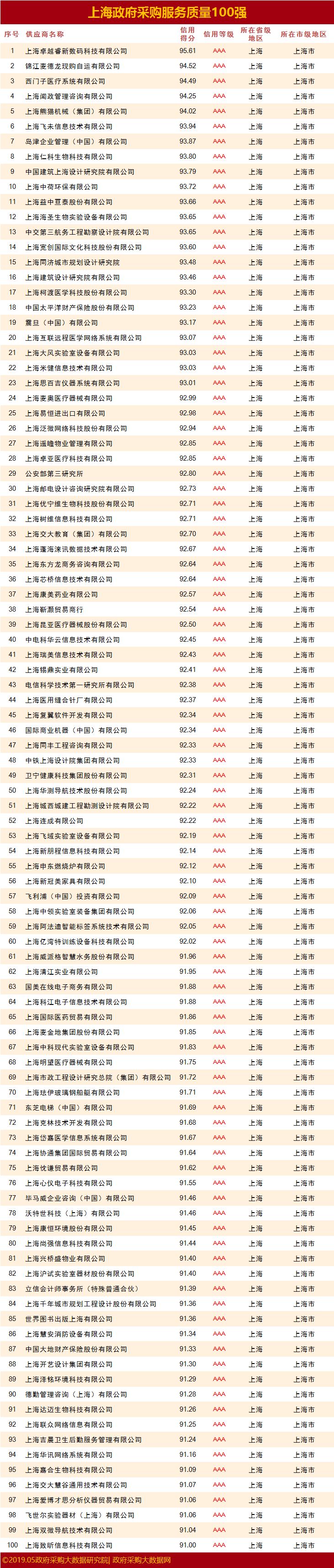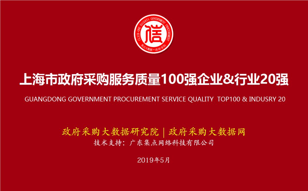 本报告(榜单)中采取全样本分析,涵盖了全国政府采购社会代理机构和供应商。本报告中的研究数据一律来源于全国各级政府采购公开信息。具体数据源包括:国家级政府采购网公开项目信息、各级地方政府部门公开采购信息中公布的公开项目信息以及信用中国网等。经政府采购大数据研究院和政府采购大数据网对企业进行政府采购大数据信用评估,为政府采购服务质量优秀的企业予以公示,联合发布:上海市政府采购服务质量100强企业&行业20强企业榜单。政府采购服务质量大数据信用报告评估期为1年,评估时段为:2018年3月1日至2019年4月30日。公示日期为:2019年5月14日至2019年5月21日。